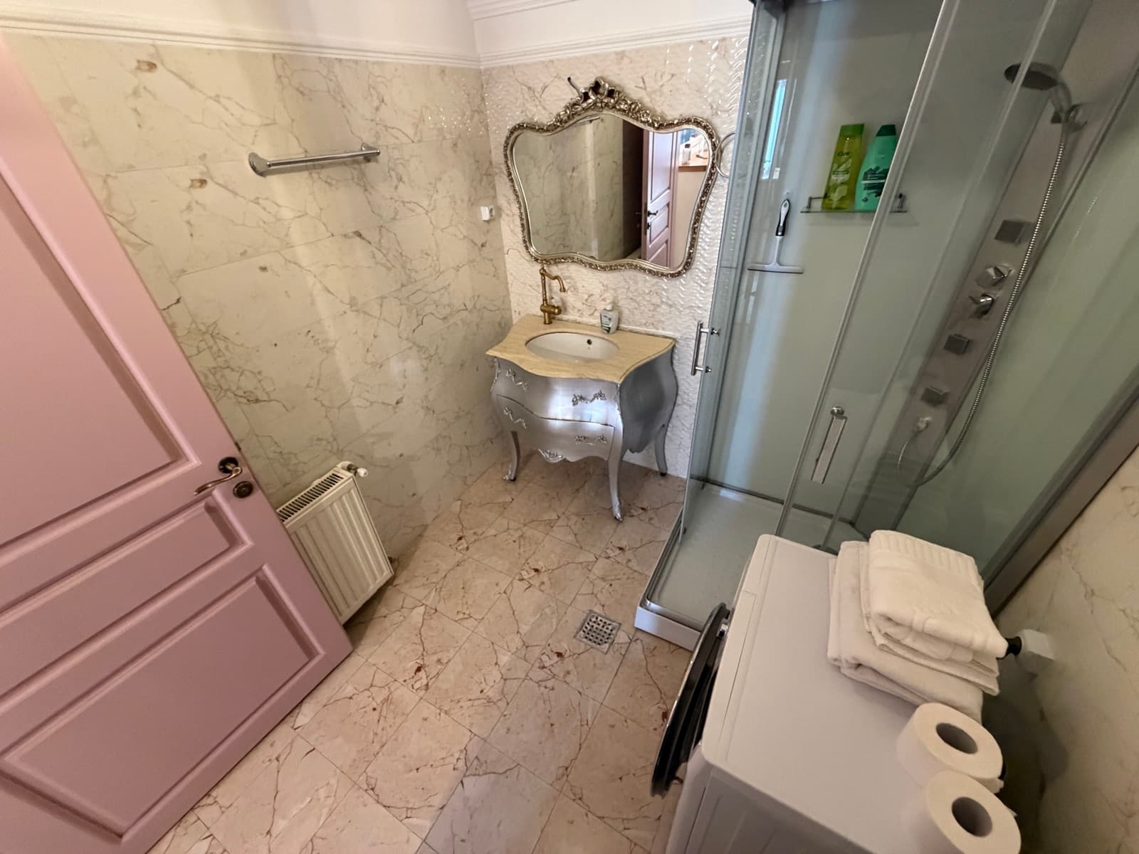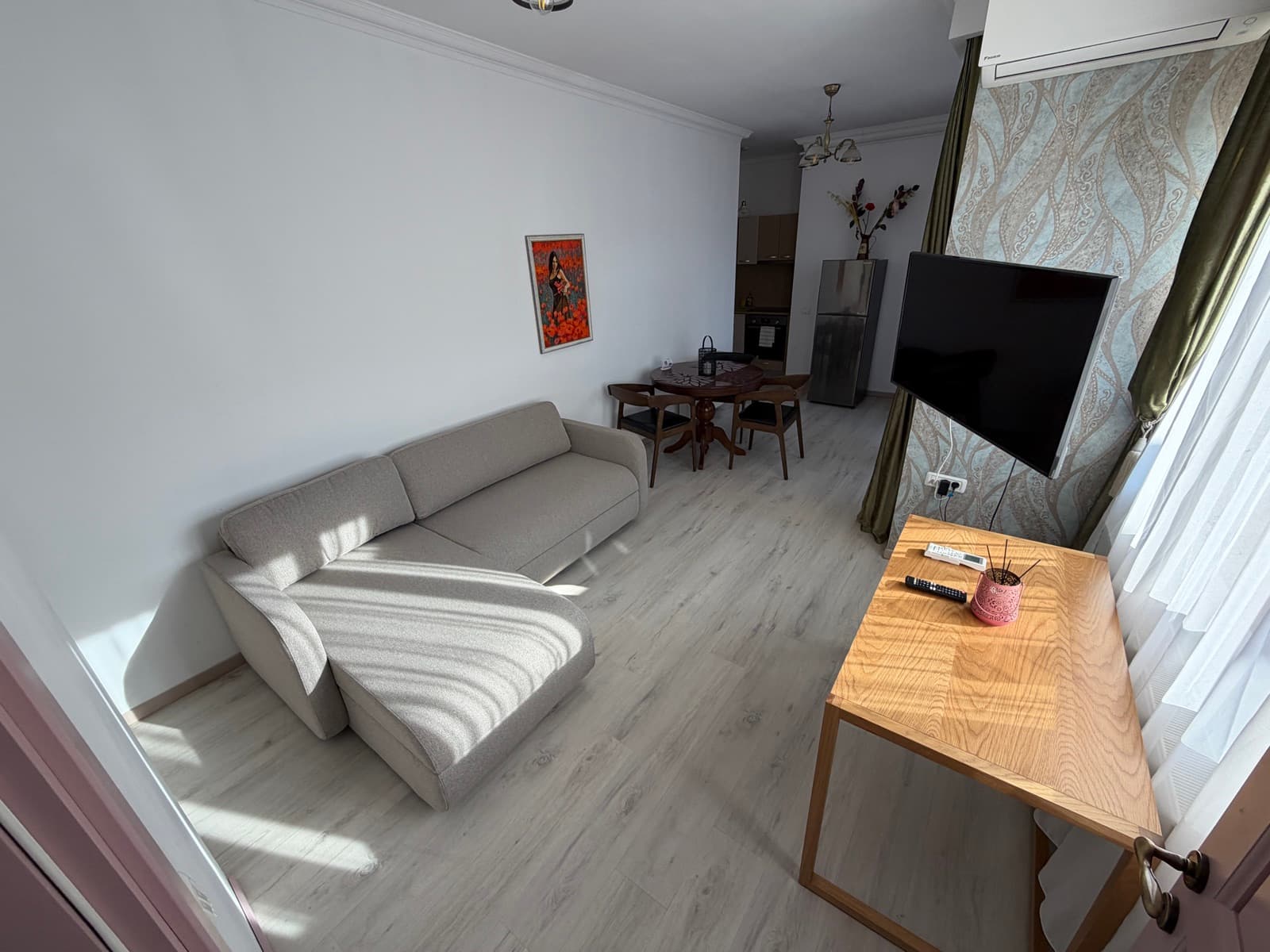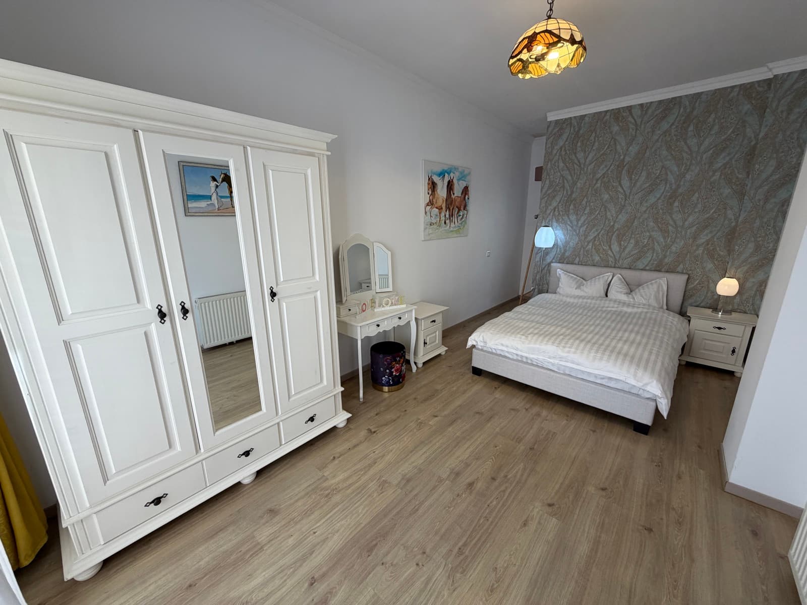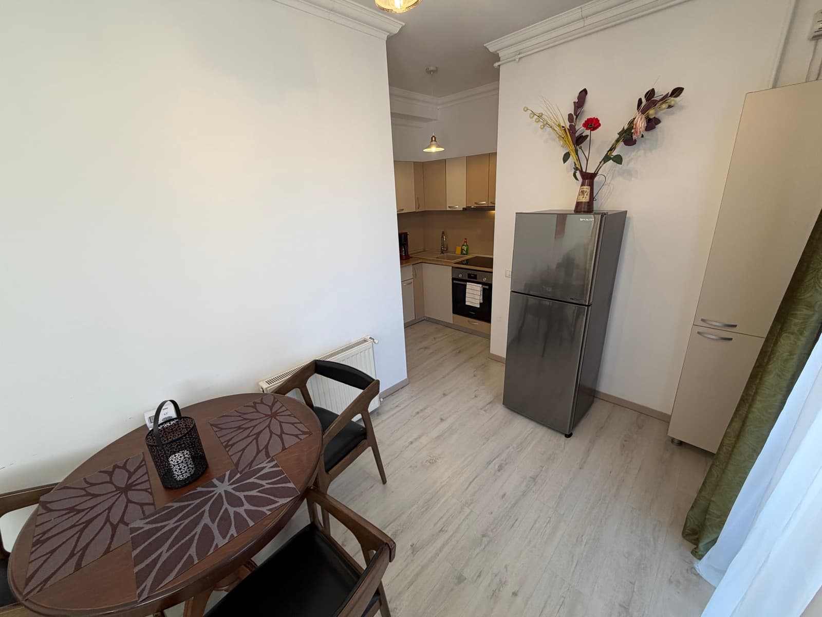Apartamentul Goldring este alegerea ideală pentru familii sau sejururi prelungite. Acest spațiu generos cuprinde un dormitor separat cu pat king-size și lenjerie premium, o zonă de living cu canapea extensibilă și televizor, precum și o bucătărie complet echipată cu plită, cuptor cu microunde, frigider și tot ce ai nevoie pentru a pregăti o masă. Zona de dining, cu masă din lemn masiv pentru patru persoane, se deschide către living printr-un arc decorativ. Decorul păstrează farmecul de epocă al clădirii, cu parchet original restaurat și tavan înalt cu stucatură.