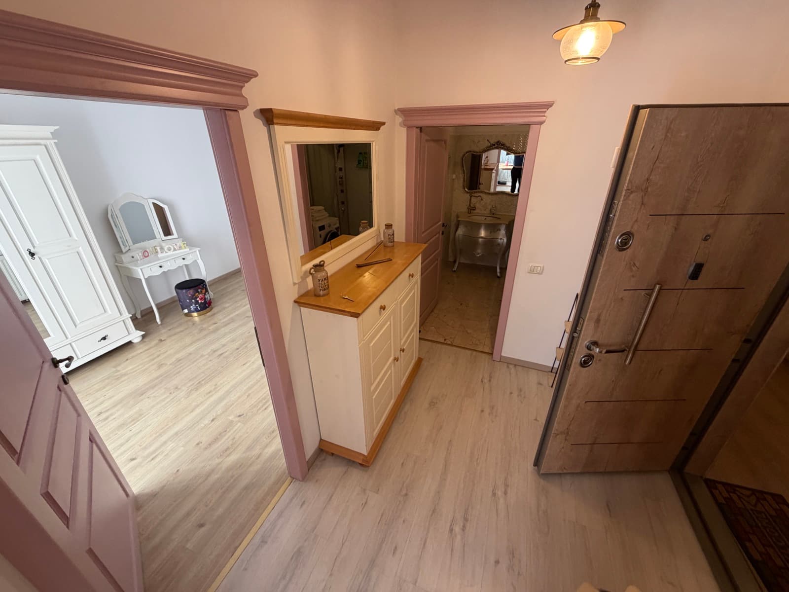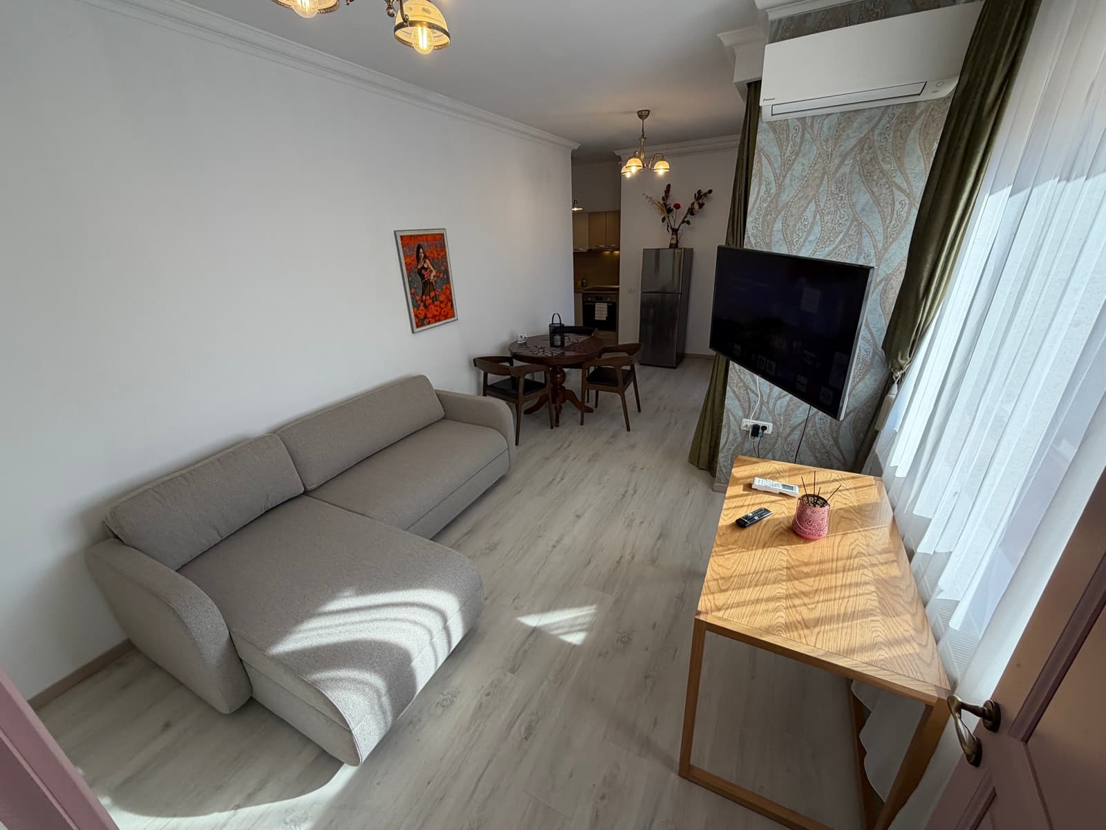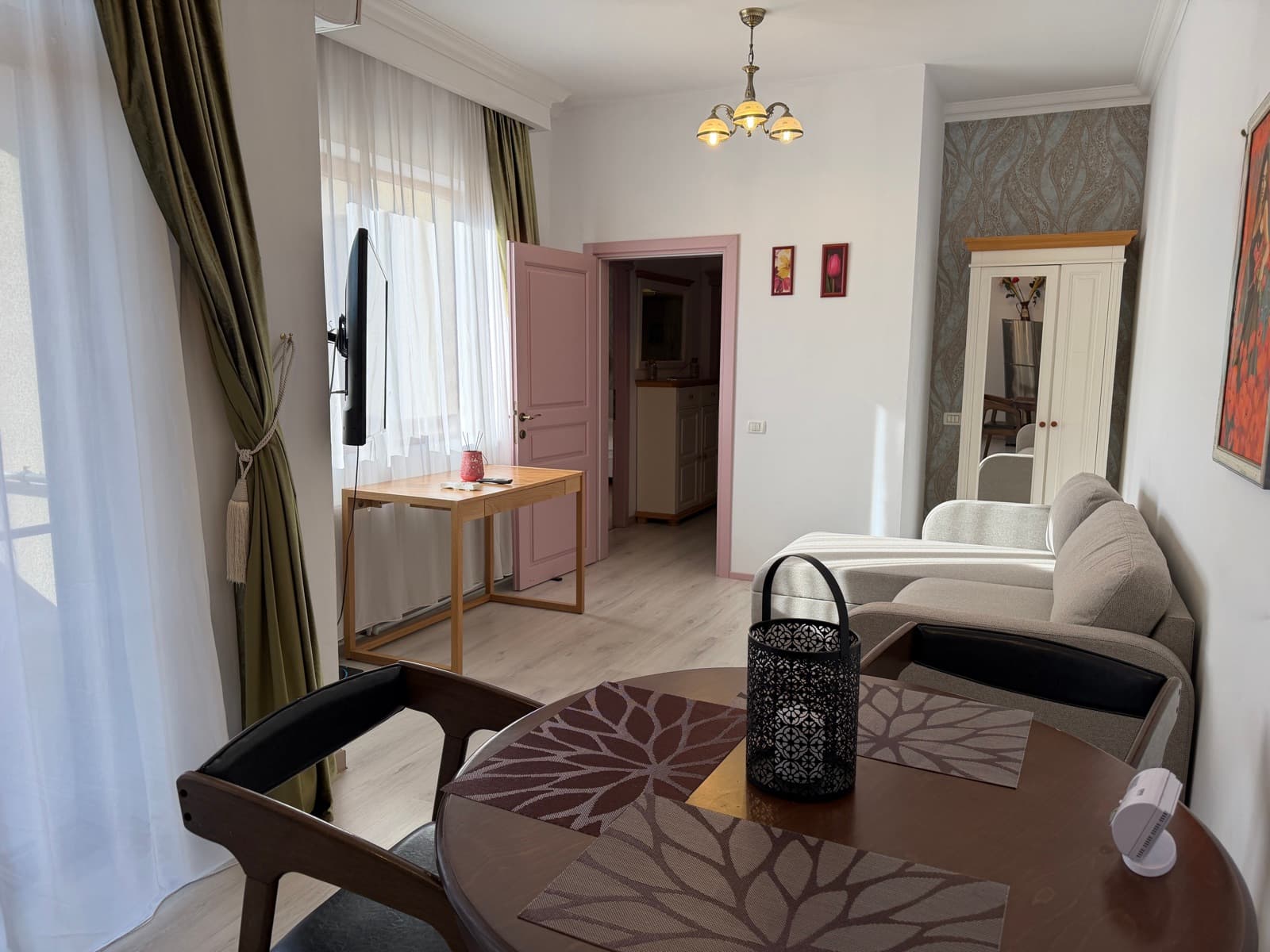 Apartamentul Goldring este alegerea ideală pentru familii sau sejururi prelungite. Acest spațiu generos cuprinde un dormitor separat cu pat king-size și lenjerie premium, o zonă de living cu canapea extensibilă și televizor, precum și o bucătărie complet echipată cu plită, cuptor cu microunde, frigider și tot ce ai nevoie pentru a pregăti o masă. Zona de dining, cu masă din lemn masiv pentru patru persoane, se deschide către living printr-un arc decorativ. Decorul păstrează farmecul de epocă al clădirii, cu parchet original restaurat și tavan înalt cu stucatură.